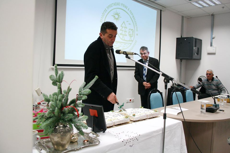 Ο Δήμαρχος Ερυμάνθου κ. Θ. Μπαρής κόβει την πίτα του Συλλόγου απευθύνοντας ευχές και αφιερώνοντας το κομμάτι στους εθελοντές που αγωνίζονται για την προστασία του περιβάλλοντος και ειδικότερα στο Σύλλογο Προστασίας Υγείας & Περιβάλλοντος του ΚΥΧ.