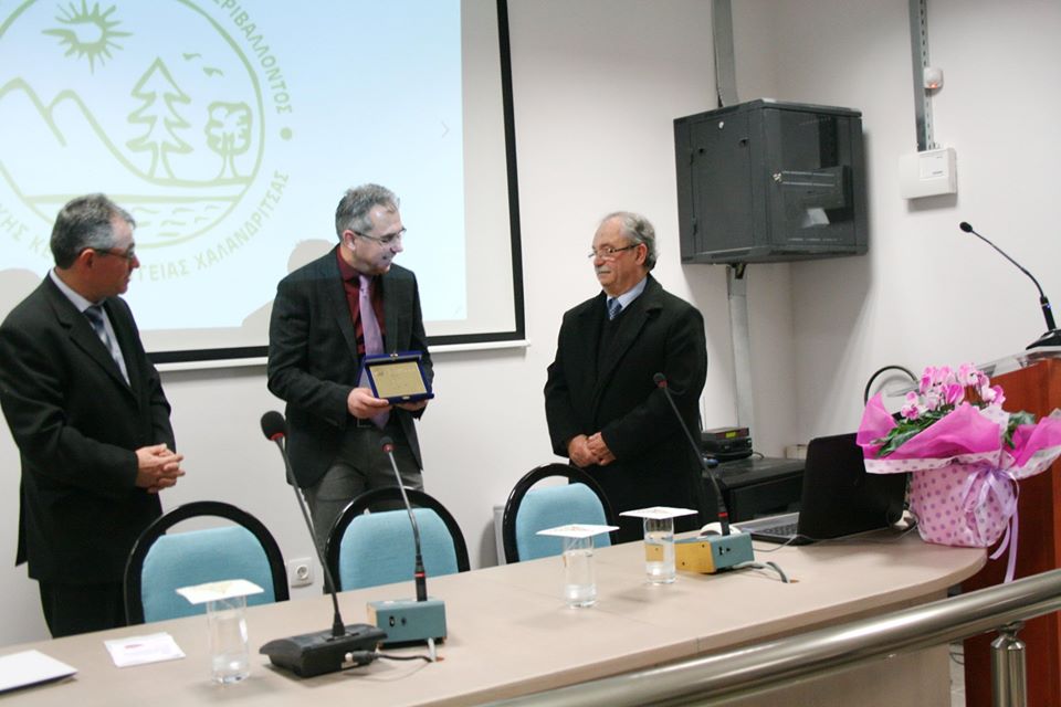 Ο Δήμαρχος Ερυμάνθου κ. Θ. Μπαρής επιδίδει στον κ. Παν. Θεοδωρόπουλο την τιμητική διάκριση ως επιτίμου προέδρου του Συλλόγου.
