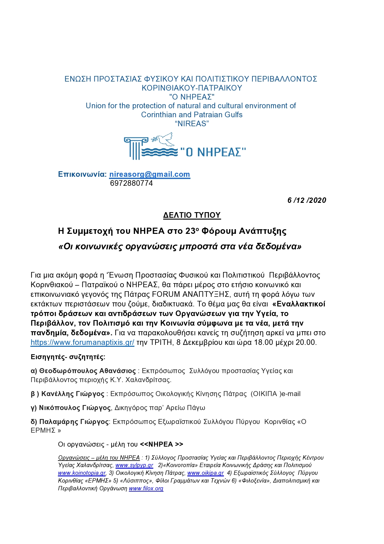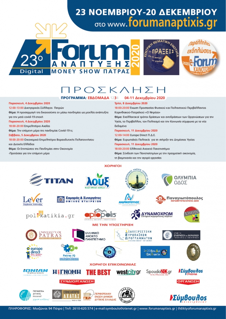 Συμμετοχή του Συλλόγου μας στο 23ο FORUM ΑΝΑΠΤΥΞΗΣ Τρίτη 8 Δεκεμβρίου, 18:00 – 20:00, στον διαδικτυακό τόπο https://www.forumanaptixis.gr/