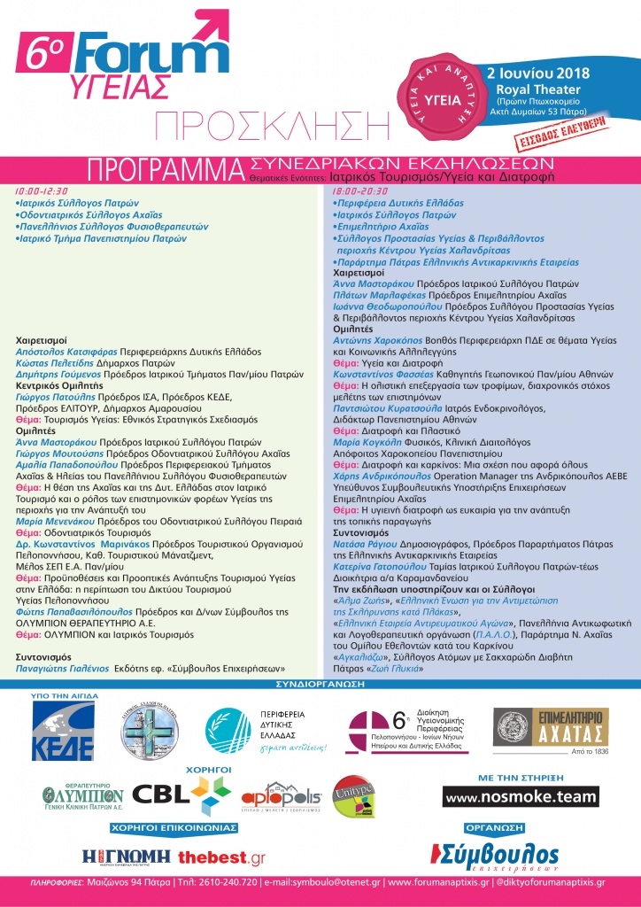 6ο Forum Υγείας. Η εκδήλωση θα γίνει το Σάββατο το απόγευμα 2 Ιουνίου 2018 στον πολυχώρο της παραλιακής, Ακτή Δυμαίων 53, στο γνωστό Royal Theatre (πρώην πτωχοκομείο). Κεντρικό θέμα της απογευματινής ημερίδας είναι ‘’ΔΙΑΤΡΟΦΗ & ΥΓΕΙΑ’’ με ενδιαφέρουσες εισηγήσεις από εκλεκτούς ομιλητές. Σας προτείνουμε να παρακολουθήσετε και να τιμήσετε με την παρουσία σας τη συμμετοχή του Συλλόγου μας.